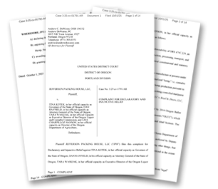 Jefferson Packing House, LLC, v. Tina Kotek, et al – 3:25-cv-01791-AR as filed on October 1, 2025, challenging the validity and enforceability of ORS 475C.229, an Oregon statute which purports to restrict and regulate the production, processing, transport, and sale of cannabis and cannabis products in ways that violate federal constitutional and statutory law.
